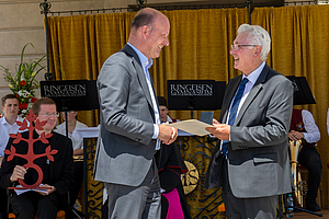 Bischof Bertram Meier würdigt das Wirken des Dominikus-Ringeisen-Werks bei der offiziellen Stabübergabe im Amt des Vorstandsvorsitzenden