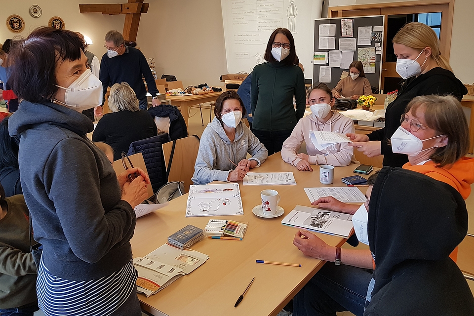Hans Obeser hat inzwischen die heutigen Kursinhalte mittels Projektor auf eine Leinwand geworfen: Wochentage, Farben, Zahlen und Uhrzeit sind die Themen des Tages – unverzichtbarer Wortschatz in fast jedem Alltagsgespräch. Im Chor wird nachgesprochen was der Kursleiter vorgibt: „Heute ist Donnerstag, morgen ist Freitag, übermorgen ist Samstag.“ Alle schauen in ihr Kursgeheft, um sich der korrekten Reihenfolge der Wochentage zu vergewissern. Dann gibt es etwas Stirnrunzeln als Hans Obeser fortfährt: „Gestern war Mittwoch, vorgestern war….?“ Juri hat am Schnellsten gemerkt, dass es nun Rückwärts geht. „Vorgestern ist Dienstag“, ruft er strahlend. „Vorgestern war Dienstag“, berichtigt ihn Paula Gärtner. Sie ist Lehrerin am Ringeisen-Gymnasium in Ursberg. Auch Hildegard Burtscher und Hans Obeser haben viele Jahre dort unterrichtet und sind genau wie Obesers Frau Maria, ebenfalls pensionierte Lehrerin, mittlerweile im Ruhestand. Sie alle haben sich spontan bereit erklärt, ehrenamtlich bei diesem besonderen Projekt mitzuarbeiten.