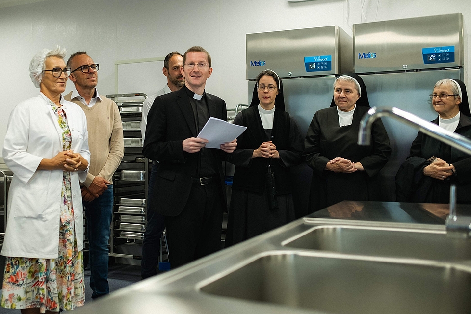Ursberg / 12. Juni 2025 – Das Dominikus-Ringeisen-Werk hat eine neue Lehrküche in Betrieb genommen. Dort werden auch zukünftig Jugendliche mit Förderbedarf über das Berufsbildungswerk ausgebildet. Nach gut 20 Jahren genügte die bisherige Lehrküche in der ehemaligen Mühle an der Prämonstratenserstraße nicht mehr den modernen Anforderungen. Der neue Ausbildungsort befindet sich in den Räumen der Ursberger Zentralküche. Bereits seit März wird in der neuen Lehrküche gebrutzelt, geknetet, gekocht und gebacken. Jetzt wurde sie von Martin Riß, DRW-Vorstandsvorsitzender und Geistlicher Direktor, offiziell gesegnet.