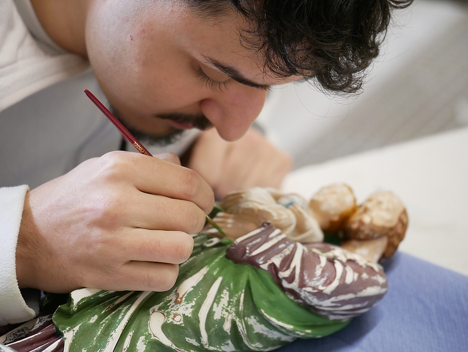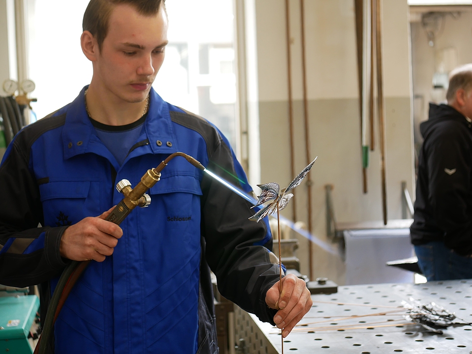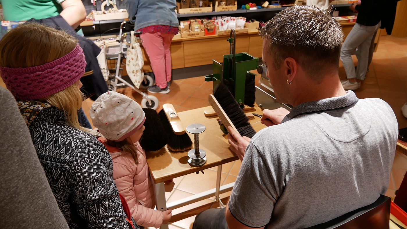Im Ursberger Laden präsentierte sich zudem die Besen- und Bürstenmanufaktur aus Pfaffenhausen. Man konnte live zusehen, wie Bürsten handgefertigt werden. Im Unterallgäu stellen Menschen mit Sehschädigung und Blindheit diese Produkte her, die in den DRW-Läden in Ursberg, Pfaffenhausen und Kloster Holzen verkauft werden. Auch in der Kreativwerkstatt in Ursberg, in der Menschen mit Handicap tätig sind, werden dekorative und nützliche Dinge u. a. aus Ton gefertigt. „Das Schöne ist, dass die Besucher unseren Handwerkern beim Tag der offenen Tür über die Schultern schauen können. Viele sind ganz überrascht, wie viel Geschick und Kreativität es dazu braucht“, so Liesenfeld. Die Azubis der Malerei und des Metallbetriebs zeigten, was sie schon gelernt haben und erfreuten die Besucher ihrer Betriebe u. a. mit Werkstücken wie filigran gearbeiteten Schmetterlingen aus Metall für den Garten oder mit Wegekreuzen und Statuen aus dem kirchlichen Bereich, die sie gerade restaurieren.