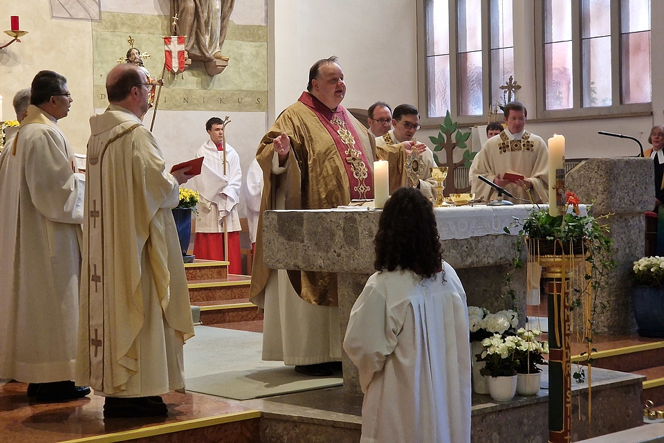 Der Festgottesdienst, der ursprünglich unter freiem Himmel im Klosterhof geplant gewesen war, musste wetterbedingt in die Kapelle St. Florian verlegt werden. Die Predigt stand ganz im Zeichen des heiligen Norbert. Er habe in einer turbulenten Zeit gewirkt, sagte Abt Petrus. Papst, Gegenpapst, Kirchenspaltung und Konflikte hätten letztlich dazu geführt, dass sich Männer nach seiner Ordensregel in Ursberg zusammengefunden hätten und ein Kloster gründeten. „Auch bei uns geht heute manches drunter und drüber. Viele Menschen wissen nicht mehr, an was sie sich halten sollen“, sagte der Abt. Oft drehe sich alles nur noch um den eigenen Egoismus. Ein Blick auf das Leben des heiligen Norbert könne Orientierung geben.